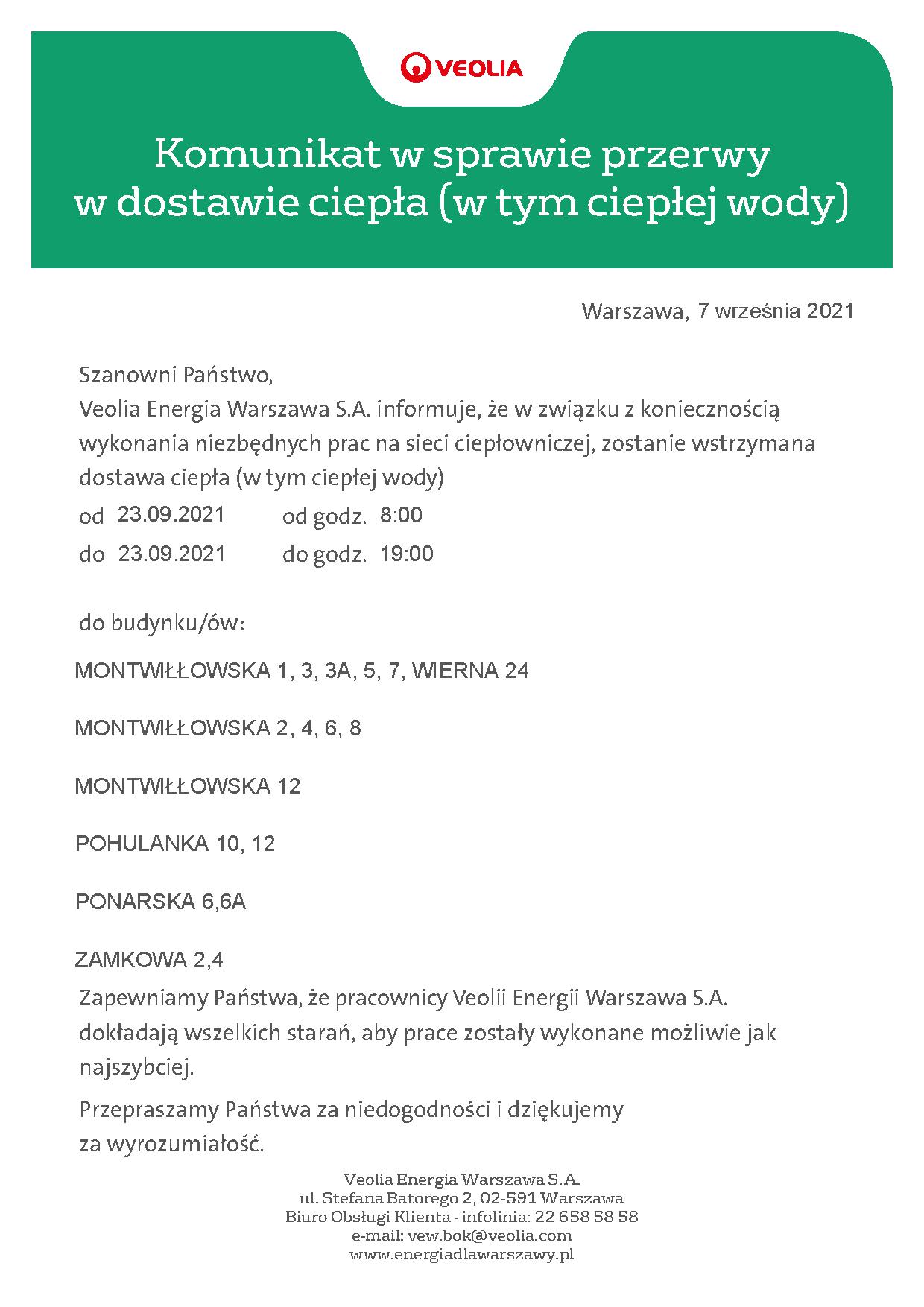 Komunikat w sprawie przerwy w dostawie ciepła (w tym ciepłej wody) w dniu 23.09.2021