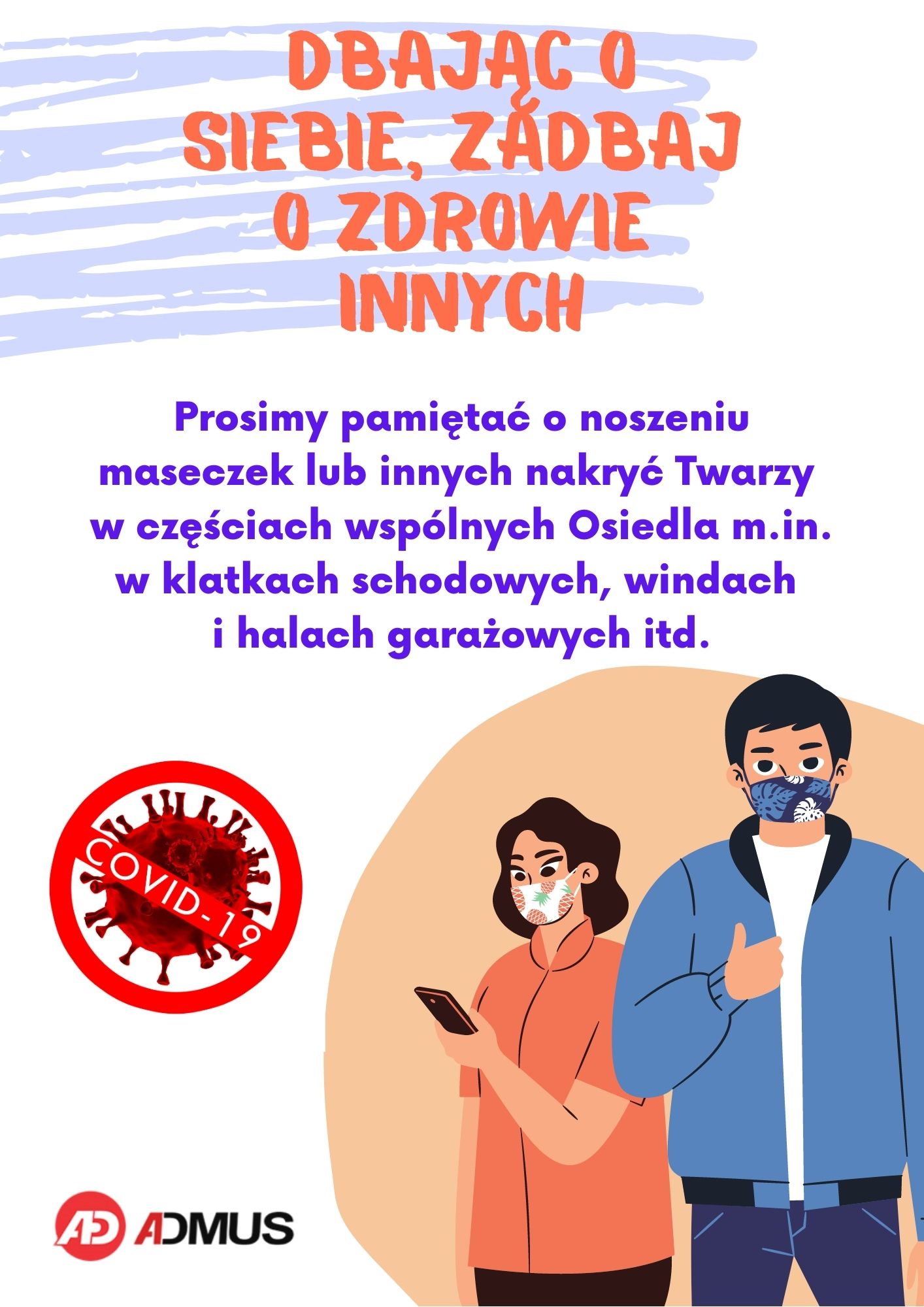 Prosimy pamiętać o noszeniu maseczek lub innych nakryć twarzy w częściach wspólnych Osiedla m.in. w klatkach schodowych, windach i halach garażowych itd.