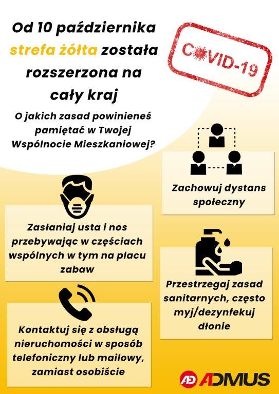 Dotychczas w Polsce funkcjonowały trzy strefy – zielona, żółta i czerwona. W tych dwóch ostatnich obowiązywały dodatkowe zasady bezpieczeństwa. Od 10 października 2020 roku obostrzenia ze stref żółtych zostają rozszerzone na cały kraj. Szczegóły dotyczące wprowadzonych obostrzeń można znaleźć tutaj