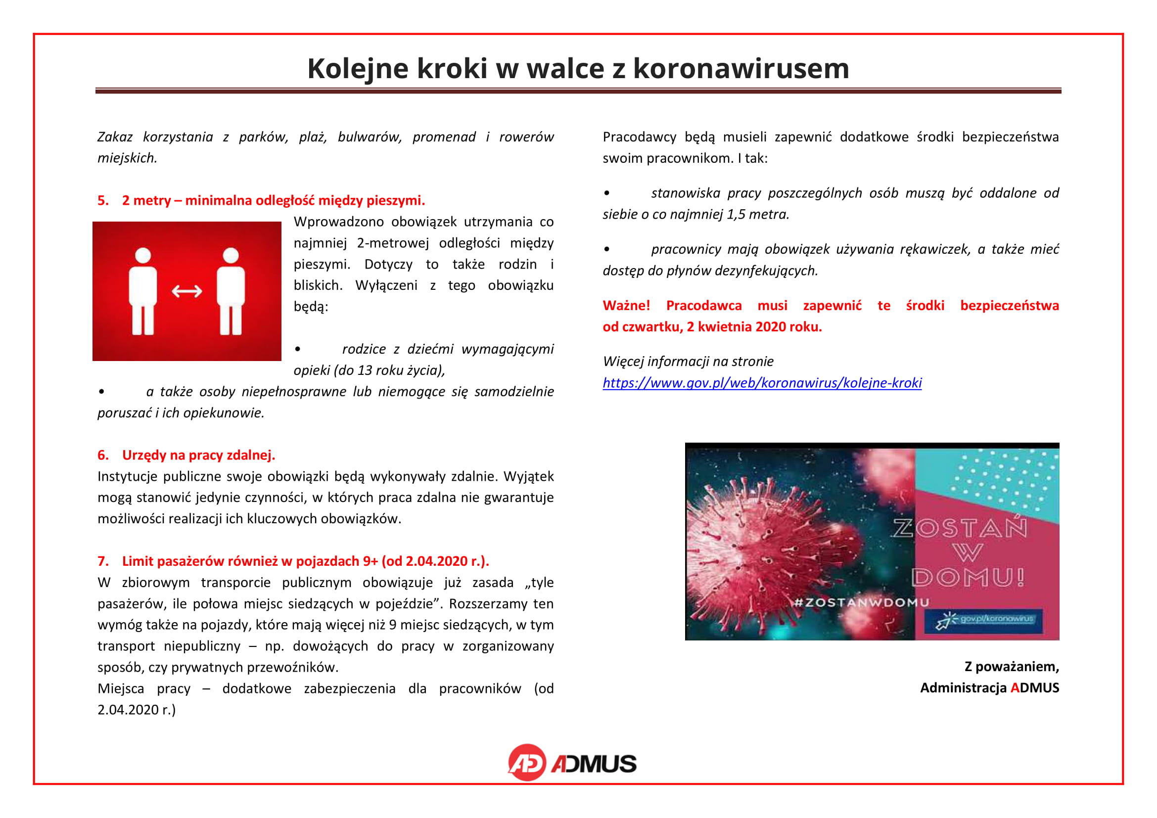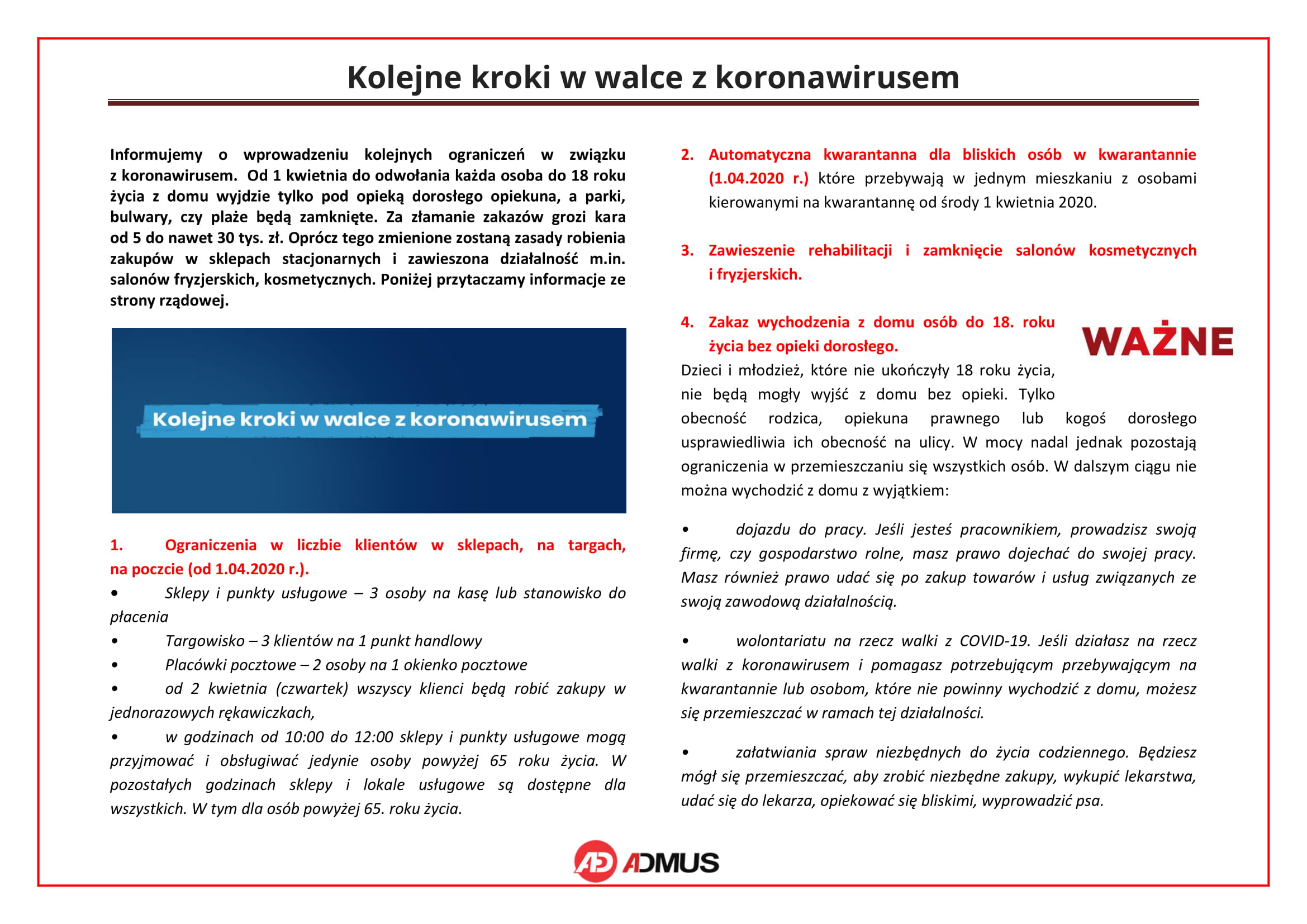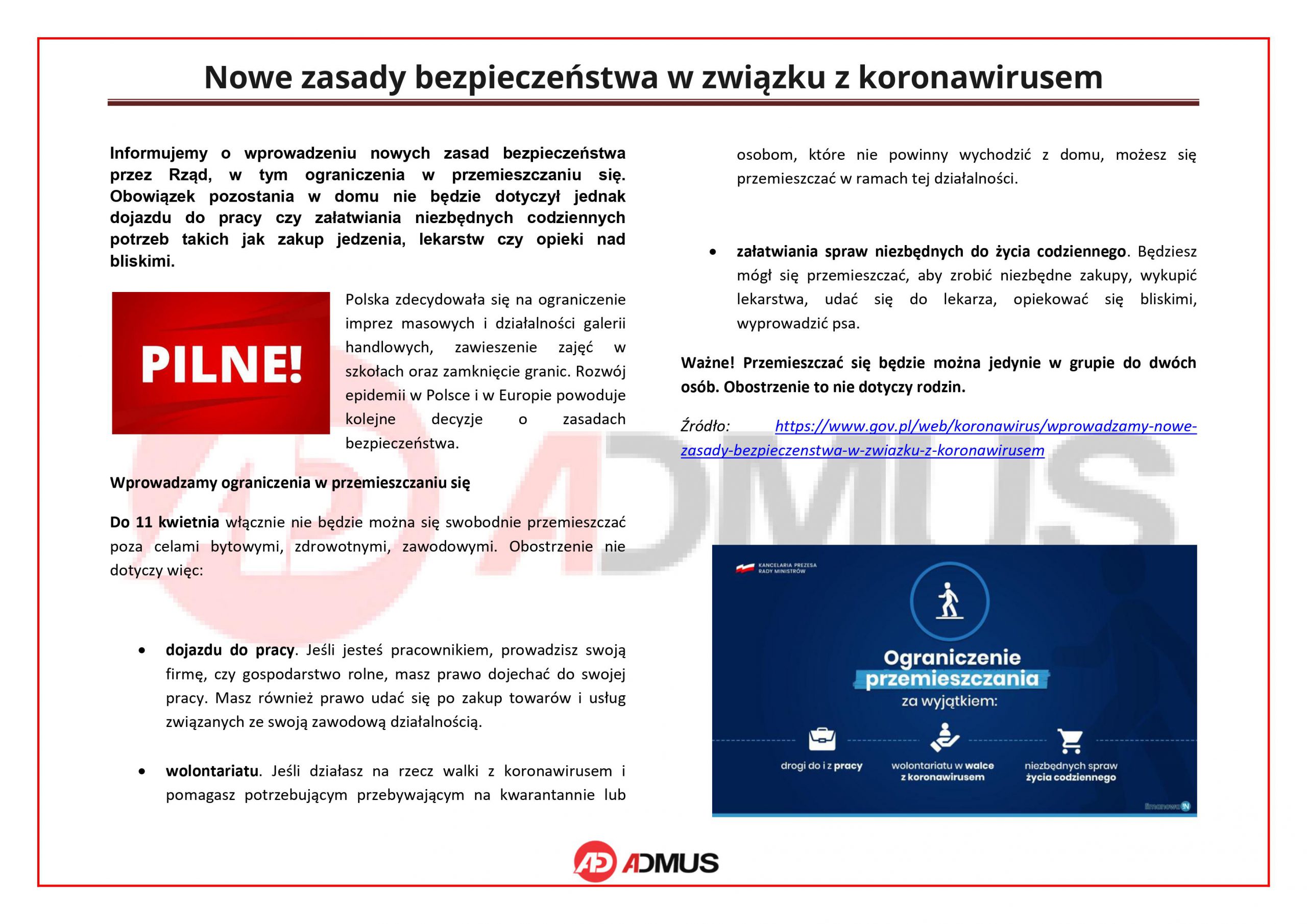 W środę w godzinach wieczornych zostało opublikowane Rozporządzenie Rady Ministrów zmieniające rozporządzenie w sprawie ustanowienia określonych ograniczeń, nakazów i zakazów w związku z wystąpieniem stanu epidemii, które nakłada obowiązek zasłaniania części twarzy (ust i nosa) za pomocą odzieży lub jej części, maski albo maseczki.