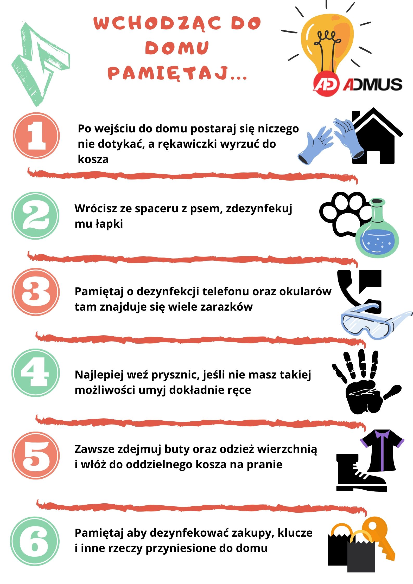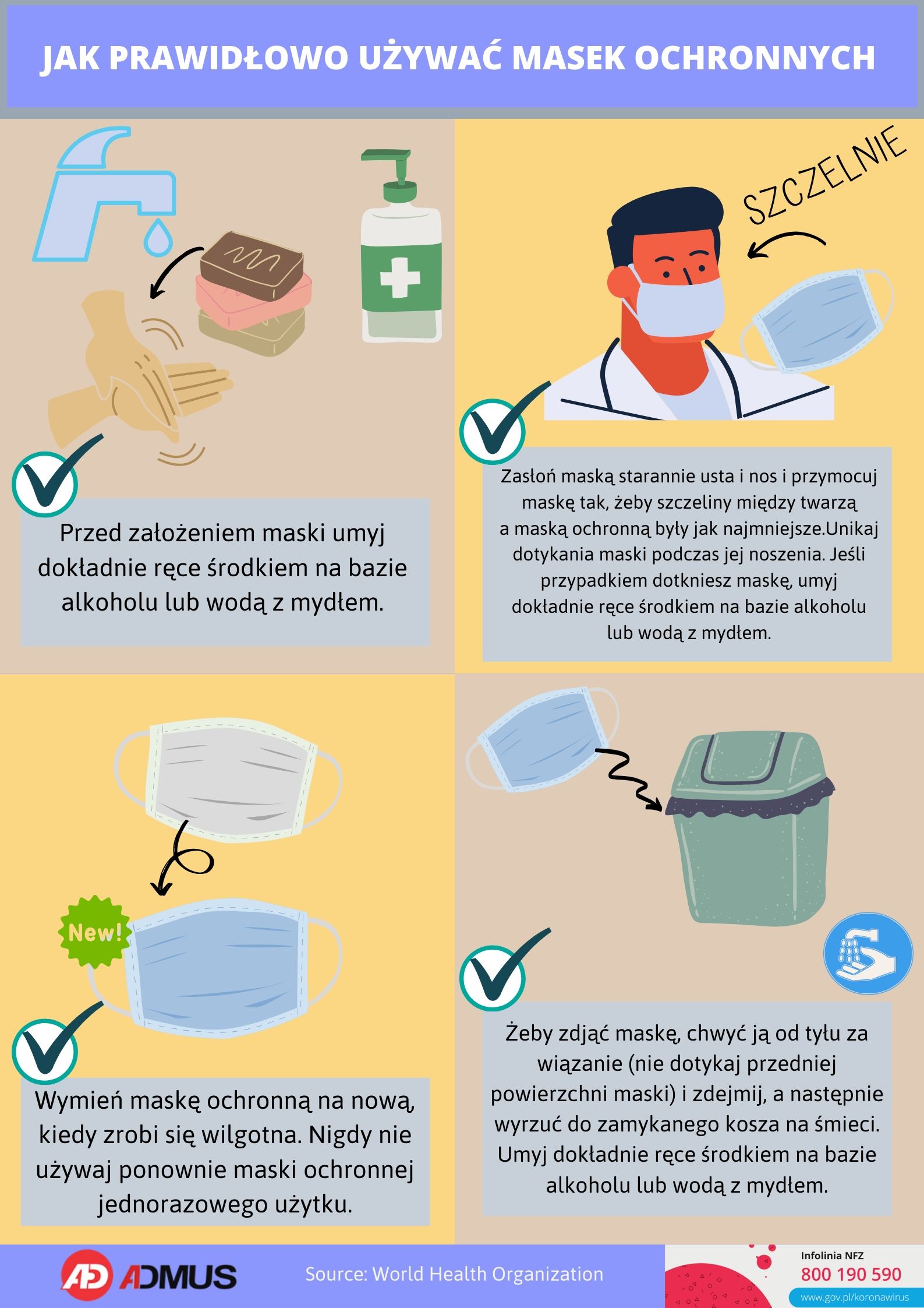 Zużyte maseczki jednorazowe i rękawiczki należy wyrzucić do odpadów zmieszanych. Maseczki wielorazowe należy sterylizować wg. wskazań producenta, a w razie ich braku przez pranie w temperaturze min. 60 st. lub przez wyparzenie.