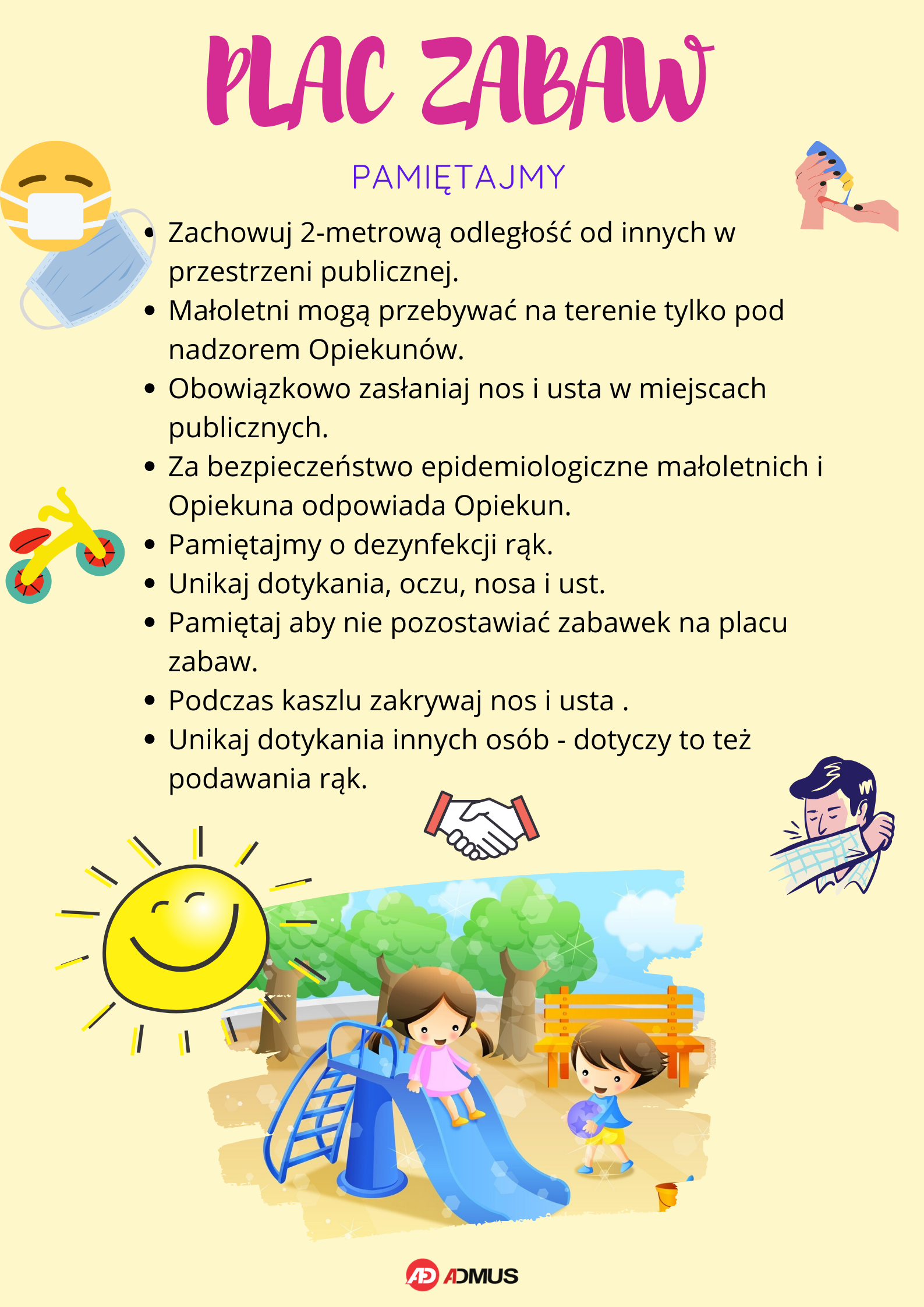 Choć nie ma jeszcze rozporządzenia Ministerstwa Zdrowia jak korzystanie z placu zabaw ma wyglądać w praktyce, to wiemy na pewno, że na placu zabaw trzeba będzie zachować dwumetrowy dystans od innych osób, w przypadku braku możliwości zachowania dystansu rodzice i opiekunowie dzieci będą musieli zakrywać nos oraz usta, używając w tym celu np. maseczki. Taka zasada nie będzie obowiązywać dzieci. Ostateczny kształt dokumentu jest konsultowany przez sanepid.