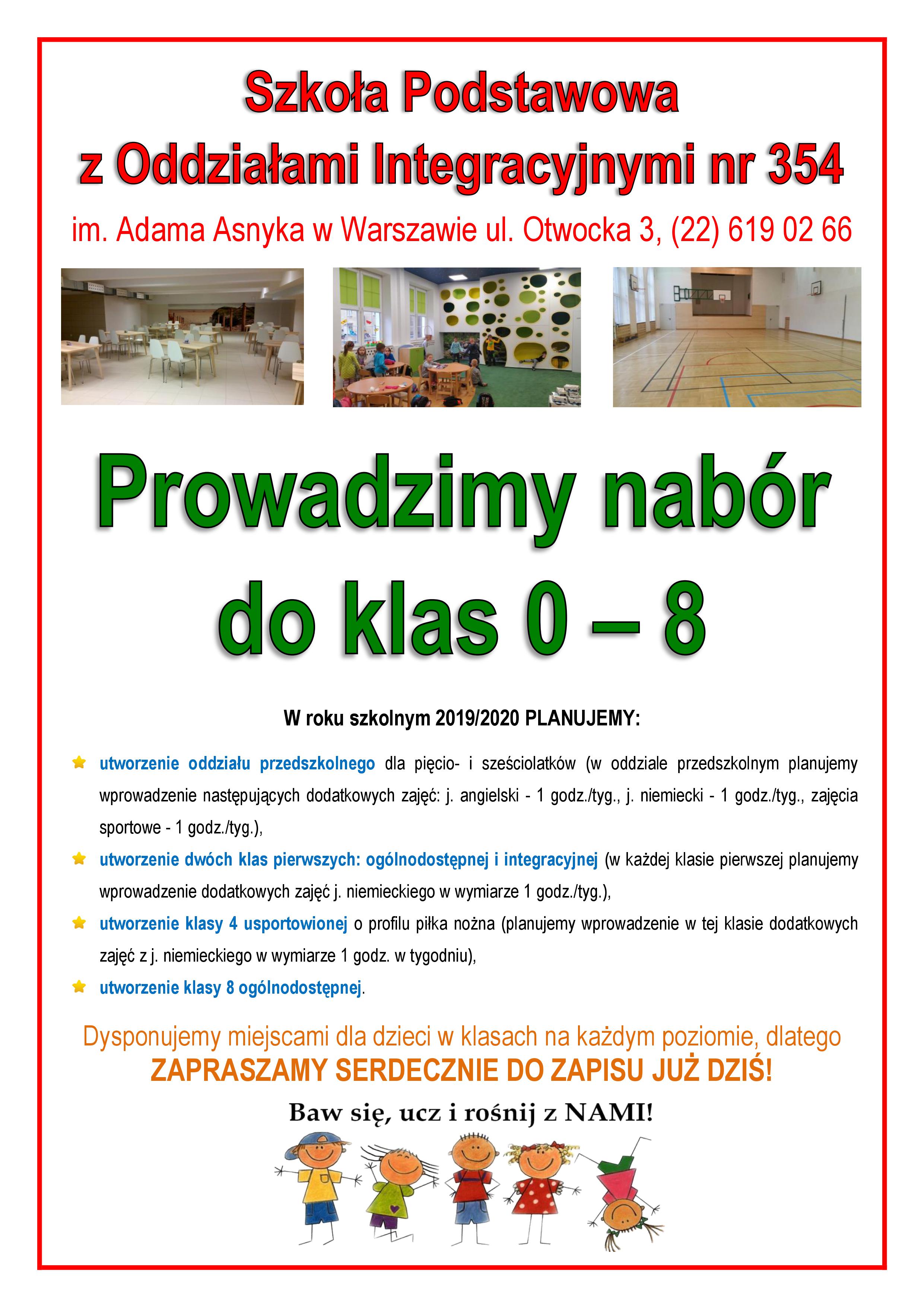 Szkoła Podstawowa z Oddziałami Integracyjnymi nr 354 im. Adama Asnyka, ul. Otwocka 3 w Warszawie, położona przy Bazylice Najświętszego Serca Jezusowego przy ul. Kawęczyńskiej, jest kameralną szkołą podstawową skupioną na dobru dzieci i ich efektywnym rozwoju. Posiadamy po 1 – 2 klasy na każdym poziomie edukacyjnym, co pozwala na podmiotowe podejście do każdego dziecka, umożliwia skuteczniejsze zajęcie się jego problemami i oczekiwaniami. Nasza szkoła nigdy nie będzie przepełnionym molochem, dzięki czemu każde dziecko ma możliwość zakończyć edukację spełnione edukacyjnie i opiekuńczo. Staramy się wspierać rozwój naszych wychowanków tematycznymi zajęciami dodatkowymi, które pozwalają dzieciom na rozwój ich zainteresowań i uzdolnień. Dysponujemy własną stołówką szkolną, gdzie panie kucharki gotują smacznie, różnorodnie i zdrowo. Dzieci spożywają posiłki w wyremontowanej stołówce szkolnej, gdzie wspaniały widok na morze pozytywnie nastraja je na dalszą część dnia. Posiadamy nową bibliotekę szkolną, w której dzieci mogą wypożyczyć wiele interesujących pozycji książkowych dostosowanych do ich wieku i potrzeb a zaangażowana pani bibliotekarka stara się zachęcać dzieci do aktywnego czytania książek i czynnego uczestnictwa w życiu czytelniczym organizując tematyczne wydarzenia i konkursy. W naszej szkole każde dziecko posiada w szatni swoją szafkę zamykaną na klucz, gdzie może przechowywać swoje rzeczy. Szatnie są przestronne i wyremontowane. Nauka w naszej szkole odbywać się będzie na jedną zmianę. Naszym dzieciom umożliwiamy aktywne spędzanie wolnego czasu na dworze, w wyremontowanym i ogrodzonym ogrodzie oraz na nowym, bogato wyposażonym placu zabaw. Jesteśmy szkołą z oddziałami integracyjnymi, dlatego zapraszamy również dzieci posiadające orzeczenia bądź opinie z poradni psychologiczno-pedagogicznych. W szkole pracują wykwalifikowane nauczycielki wspomagające, które zaopiekują się Państwa dziećmi. Szkoła jako jedyna w Polsce objęta jest patronatem Warszawskiego Ogrodu Zoologicznego oraz Teatru Rampa. W naszej szkole stawiamy na dwujęzyczność i już od oddziału przedszkolnego dzieci uczą się języka angielskiego i niemieckiego. Oferujemy dodatkowe zajęcia innowacyjne o profilu piłka nożna. Dzięki zaangażowaniu trenerów i uczniów naszej szkoły, zajmujemy wiele wysokich miejsc w różnorodnych konkursach sportowych. Mottem naszej szkoły jest „tu odkryjesz swoje mocne strony, BO JE MASZ!„. Zapraszamy serdecznie na ul. Otwocką 3, do szkoły z 90-letnią tradycją.