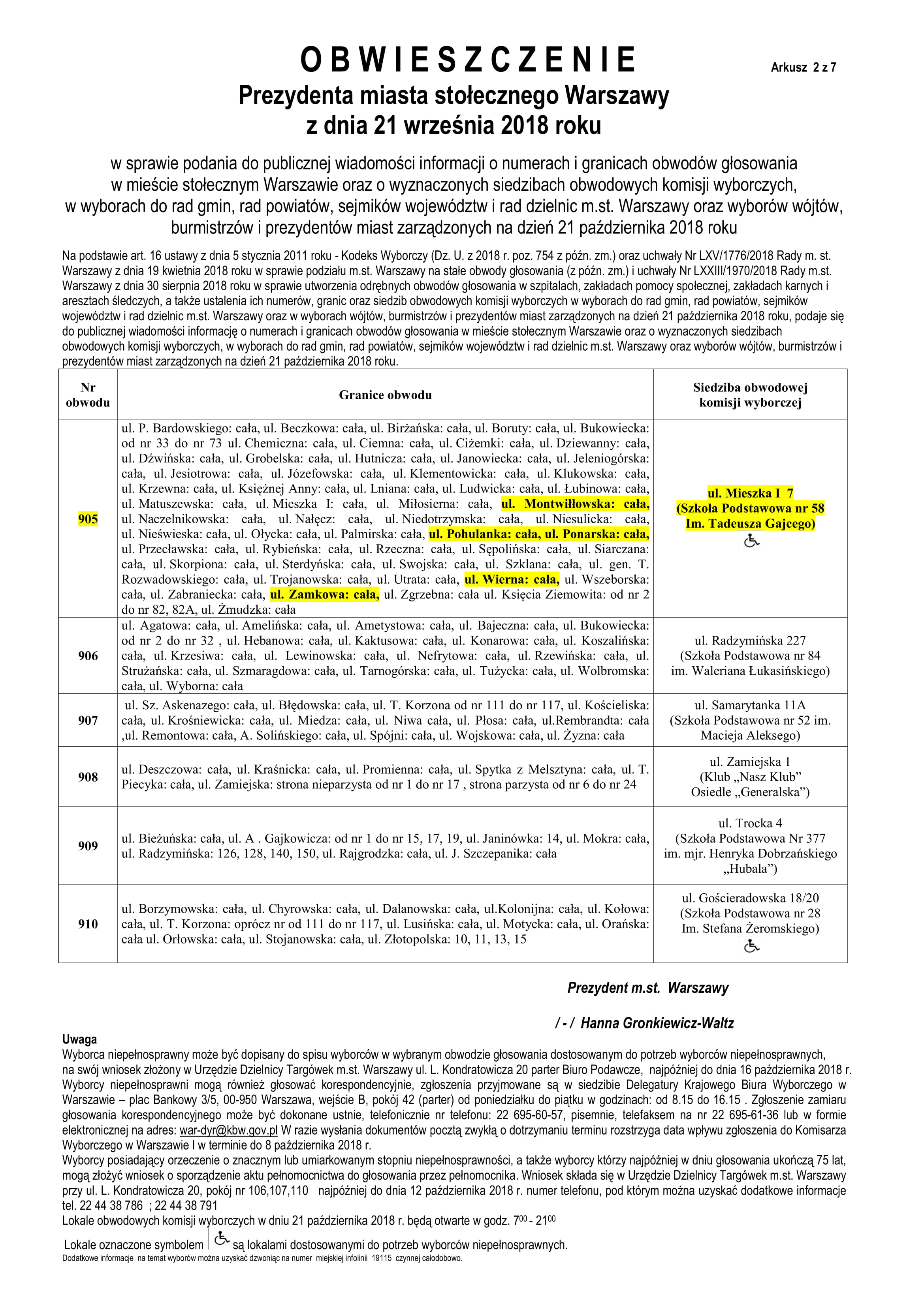 w sprawie podania do publicznej wiadomości informacji o numerach i granicach obwodów głosowania w mieście stołecznym Warszawie oraz o wyznaczonych siedzibach obwodowych komisji wyborczych, w wyborach do rad gmin, rad powiatów, sejmików województw i rad dzielnic m.st. Warszawy oraz wyborów wójtów, burmistrzów i prezydentów miast zarządzonych na dzień 21 października 2018 roku