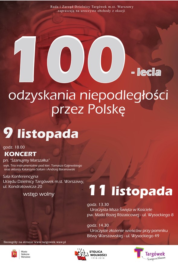 W dniu 9 listopada 2018 na terenie Sali Konferencyjnej Urzędu Dzielnicy Targówek m.st. Warszawy, znajdującego się na ul. Kondratowicza 20, odbędzie się koncert pn. „Szanujmy Marszałka”. Wstęp wolny, wszystkie szczegóły na załączonym plakacie.