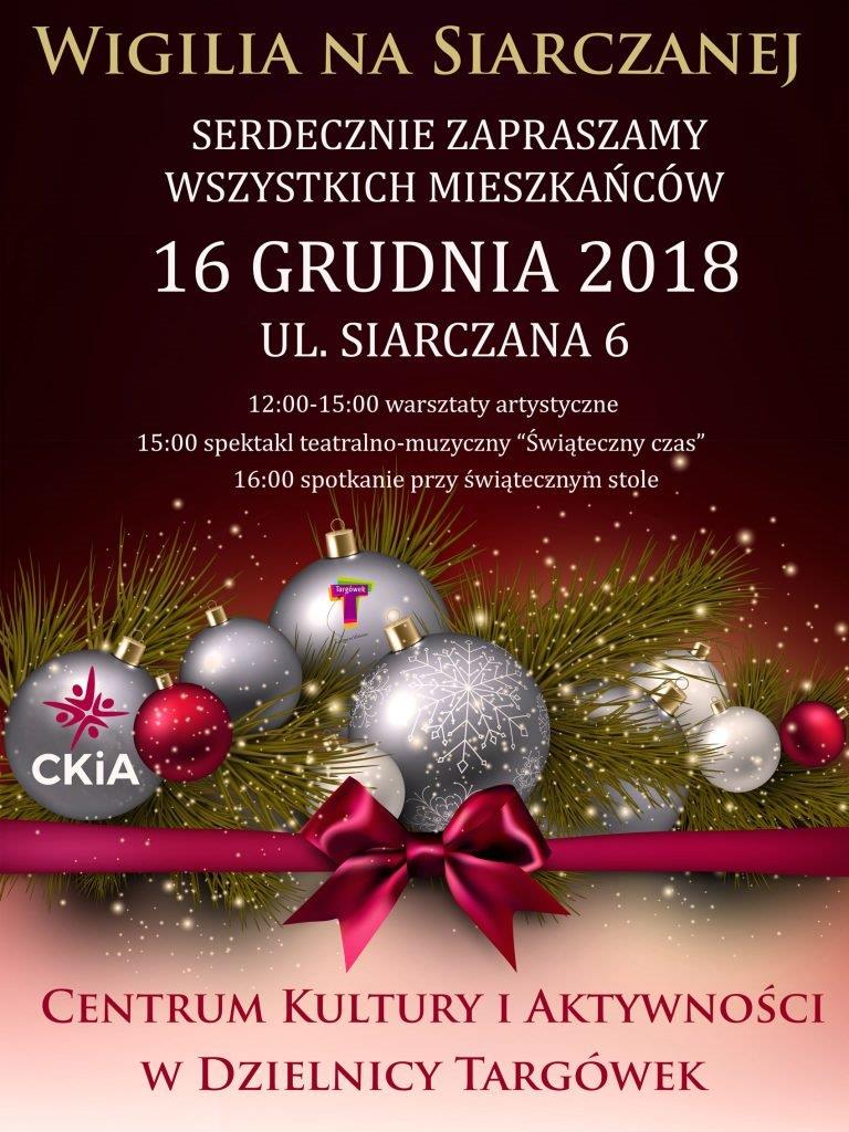 Centrum Kultury i Aktywności w Dzielnicy Targówek zaprasza na Wigilię na Siarczanej. Impreza odbędzie się w dniu 16 grudnia 2018 roku, na ul. Siarczanej 6.
